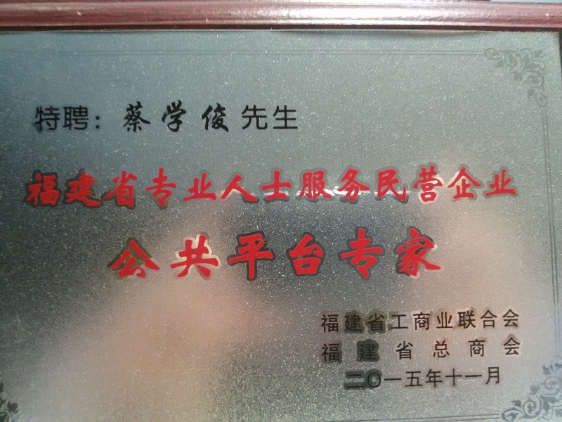 2015年,公司总经理被福建省工商业联合会和福建省总商会聘为“福建省专业人士服务民营企业公共平台专家”