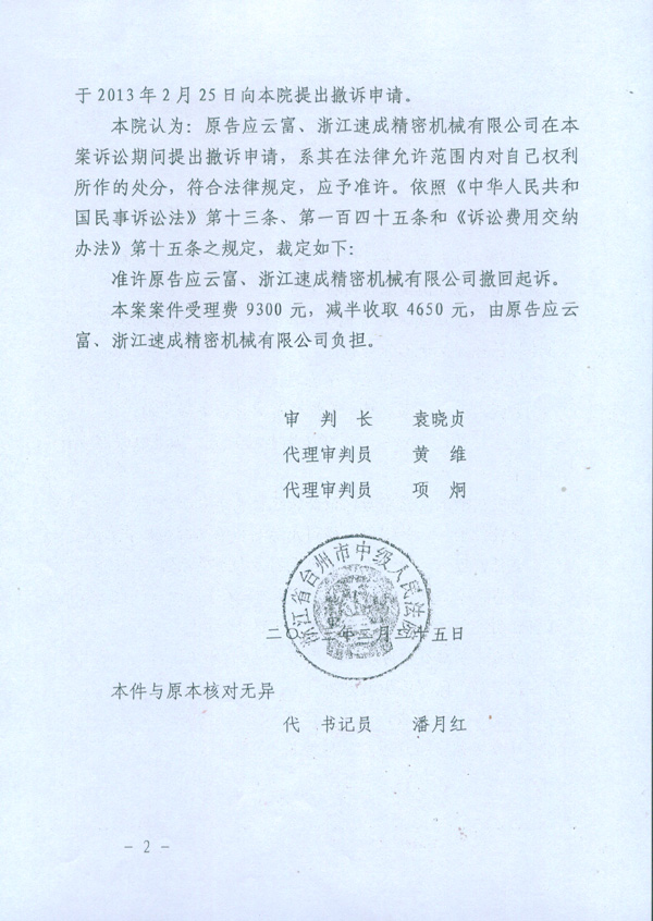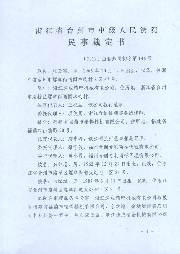 福鼎精悍精机 (2012)浙台知民初字第146号